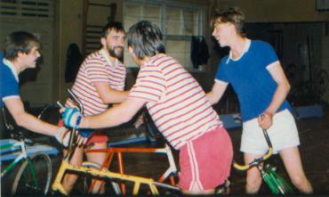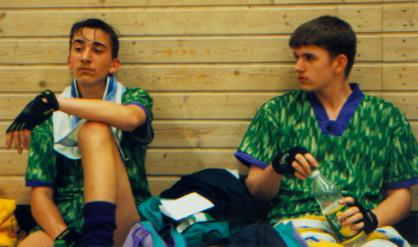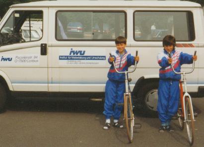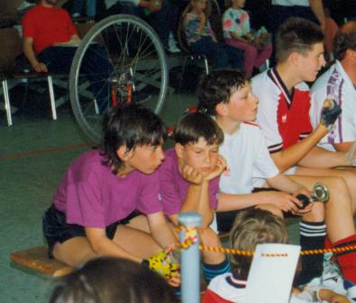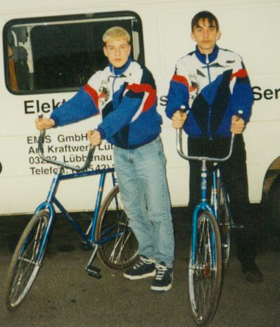Jan Pannach und Marco Heimlich nehmen 1992 als erste Cottbuser Radballmannschaft bei Deutschen Meisterschaften teil. Die damals erst 10-Jährigen belegten in der U 13 einen 7. Platz.